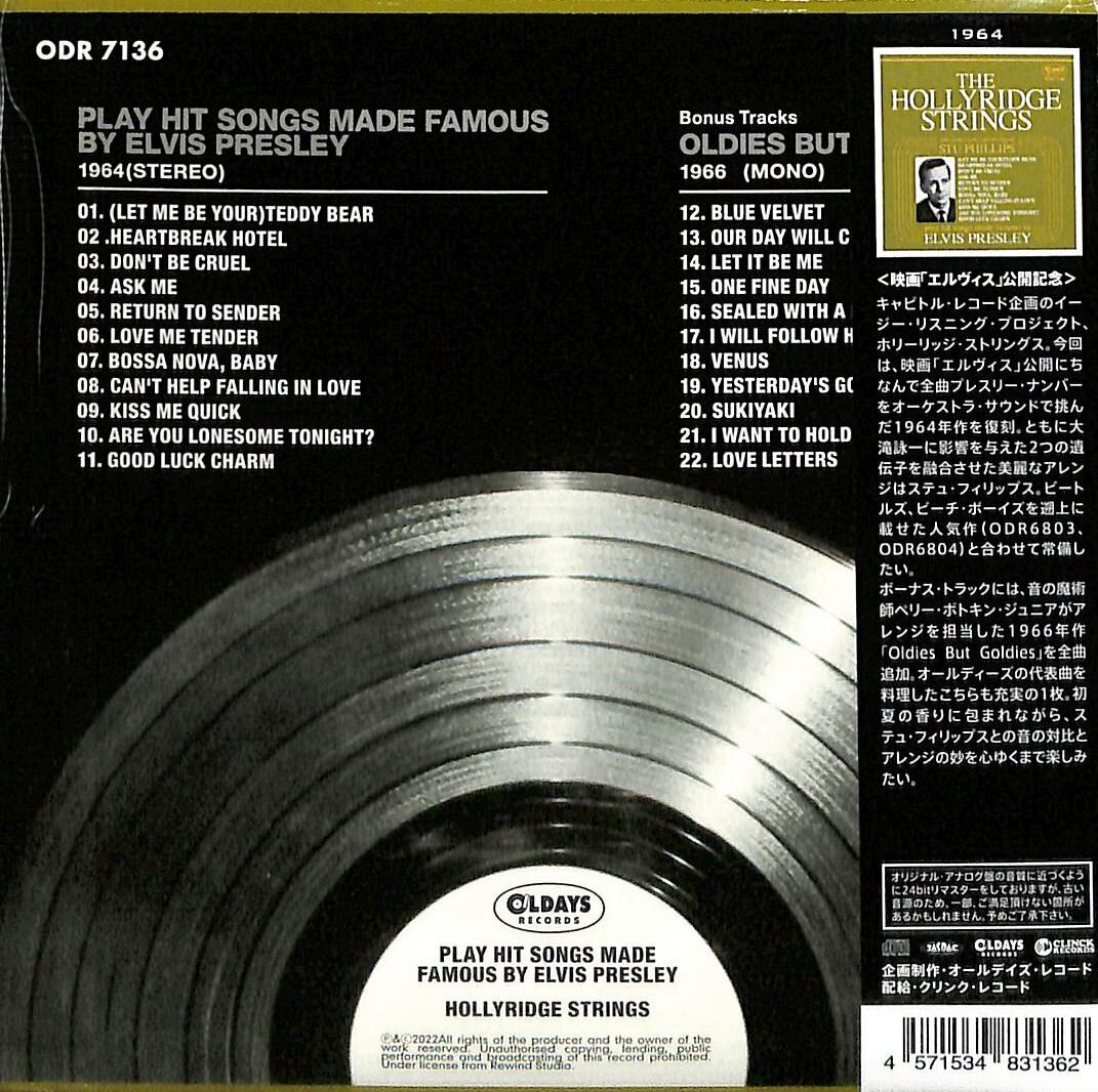 キャピトル・レコード企画のイージー・リスニング・プロジェクト、ホリーリッジ・ストリングス。今回は、映画「エルヴィス」公開にちなんで全曲プレスリー・ナンバーをオーケストラ・サウンドで挑んだ1964年作を復刻。ともに大滝詠一に影響を与えた2つの遺伝子を融合させた美麗なアレンジはステュ・フィリップス。ビートルズ、ビーチ・ボーイズを遡上に載せた人気作(ODR6803,ODR6804)と合わせて常備したい。