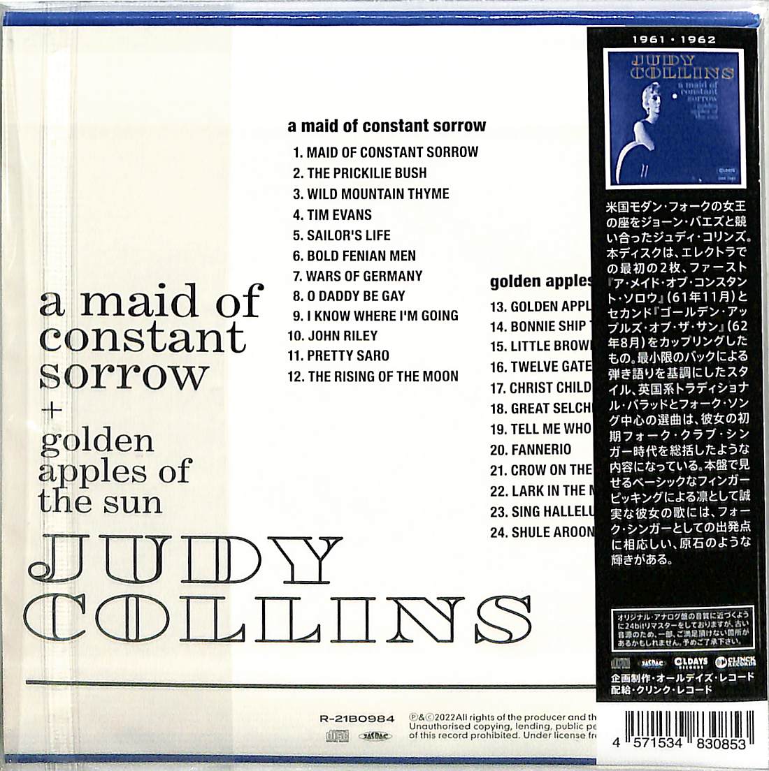 米国モダン・フォークの女王の座をジョーン・バエズと競い合ったジュディ・コリンズ。本ディスクは、エレクトラでの最初の2枚、ファースト『ア・メイド・オブ・コンスタント・ソロウ』(61年11月)とセカンド『ゴールデン・アップルズ・オブ・ザ・サン』(62年8月)をカップリングしたもの。