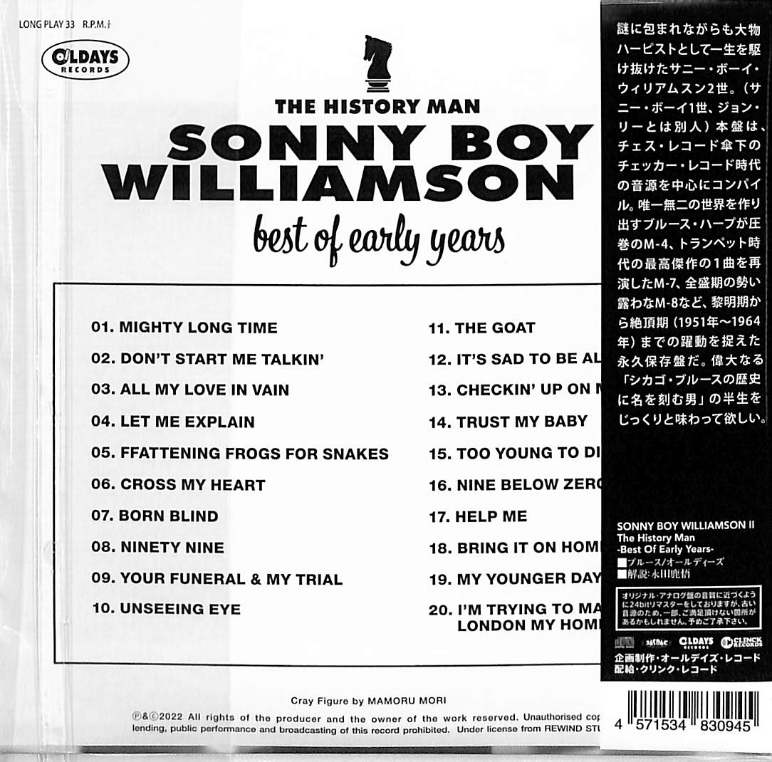 謎に包まれながらも大物ハーピストとして一生を駆け抜けたサニー・ボーイ・ウィリアムスン2世。(サニー・ボーイ1世、ジョン・リーとは別人)本盤は、チェス・レコード傘下のチェッカー・レコード時代の音源を中心にコンパイル。唯一無二の世界を作り出すブルース・ハープが圧巻のM-4、トランペット時代の最高傑作の1曲を再演したM-7、全盛期の勢い露わなM-8など、黎明期から絶頂期(1951年〜1964年)までの躍動を捉えた永久保存盤だ。偉大なる「シカゴ・ブルースの歴史に名を刻む男」の半生をじっくりと味わって欲しい。