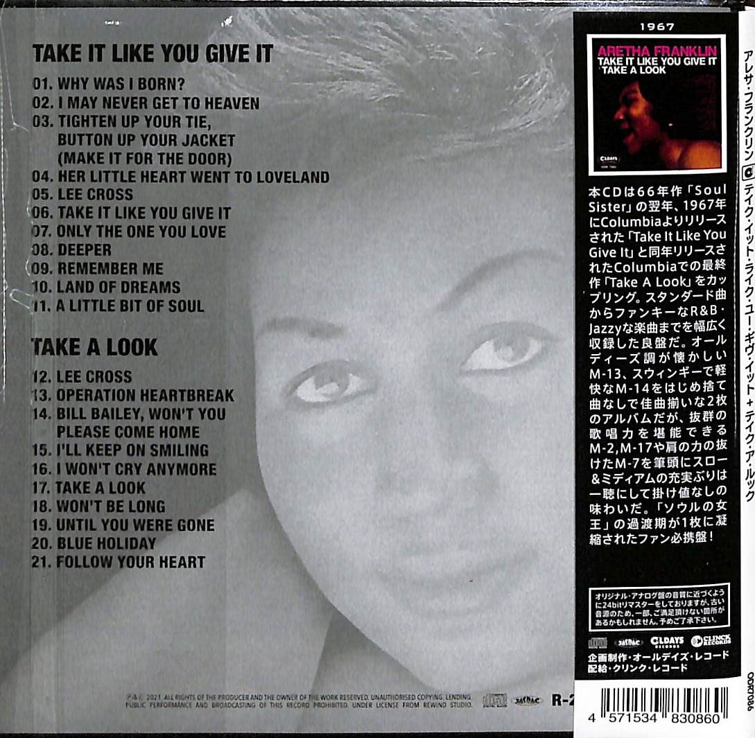 本CDは66年作「Soul Sister」の翌年、1967年にColumbiaよりリリースされた「Take It Like You Give It」と同年リリースされたColumbiaでの最終作「Take a Look」をカップリング。スタンダード曲からファンキーなR&B・Jazzyな楽曲までを幅広く収録した良盤だ。